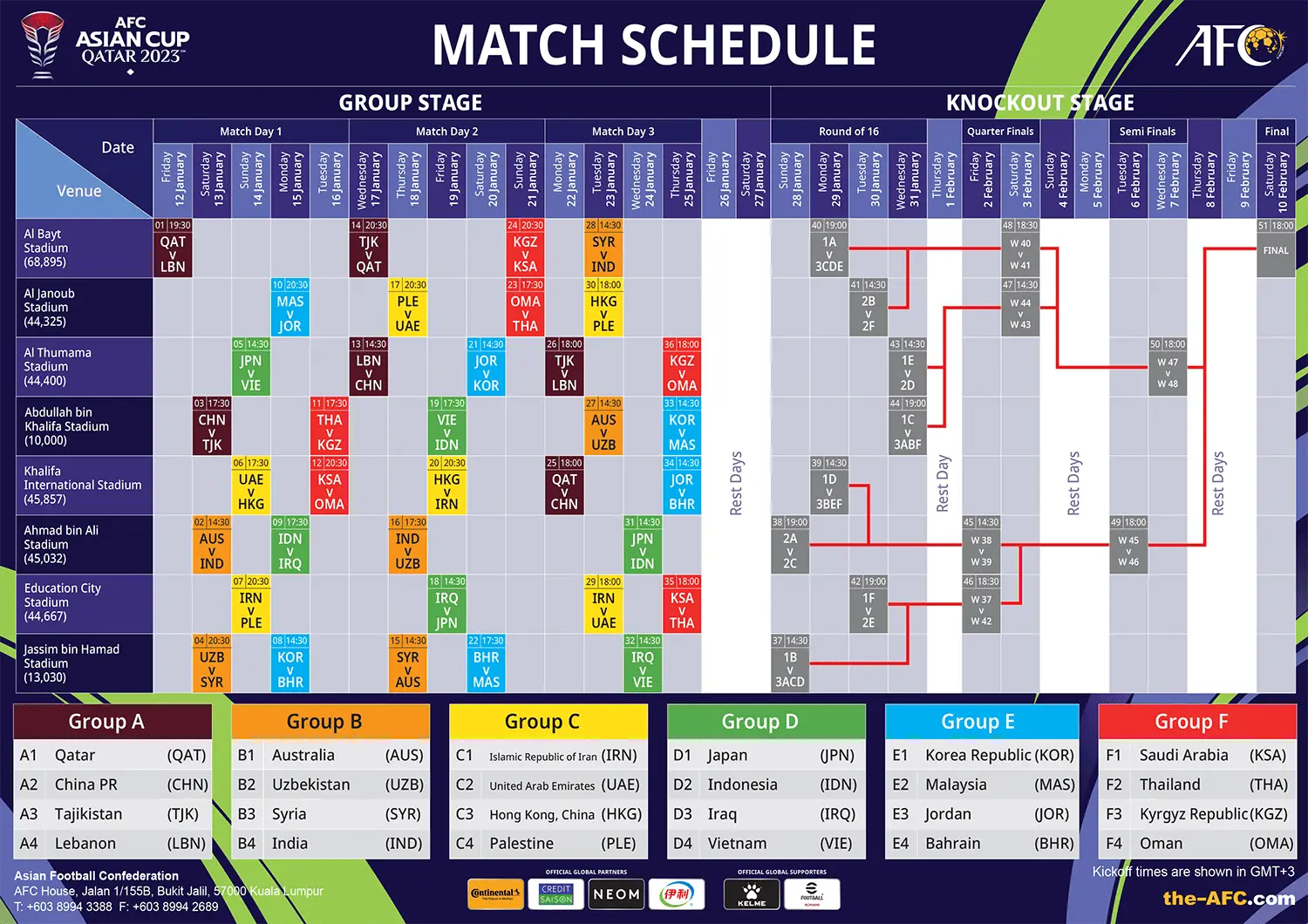 E | 马来西亚 + 约旦 | 15/1/2024 (20:30) | 阿尔瓦克拉阿尔贝特体育场 (阿尔瓦克拉) |